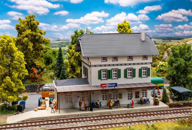 Schmuckstück der Albulalinie. Modell in Anlehnung an das dreigeschossige Stationsgebäude »Bever« mit weißer Ziegelfassade im Erdgeschoss, mit weißen Schindeln verkleideten Obergeschossen und einem mit Ziegeln bedeckten, hervorkragenden Krüppelwalmdach. Als Fundament des Modells dient ein Sockel mit Stufen, Rampe und Bahnsteig. Die Albulabahn im Schweizer Kanton Graubünden verbindet Thusis am Hinterrhein mit dem Kurort St. Moritz im Engadin. Der Bausatz besteht aus einem Materialmix aus Kunststoff und Holz/Spezialkarton.