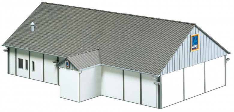 Ein typisches Gebäude einer ALDI-Niederlassung aus den Bereichen Süd und Nord, mit Anlieferzone, breitem Eingangsbereich und diversen Einkaufswagen. Dekobogen für Süd und Nord.