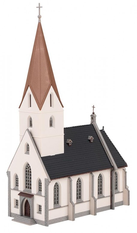 Modell einer weißen, einschiffigen Stadtkirche mit Apsis, quadratischem Turmgrundriss und einem Faltdach.