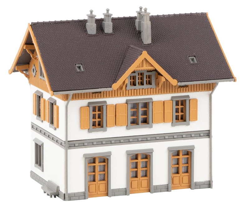 Ländliches Gebäudemodell mit heller Putzfassade und einem Dachgeschoss mit Holzverschalung und Gauben. Im Erdgeschoss befindet sich eine kleine Postfiliale.