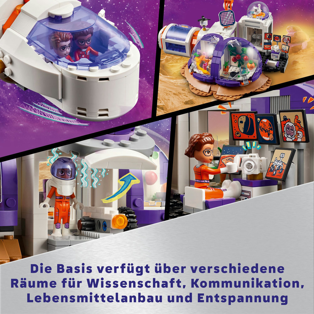 Das LEGO Friends Weltraum-Spielzeug für Mädchen und Jungen ab 8 Jahren beinhaltet 3 Minipuppen und eine Spielzeug-Katze sowie eine LEGO Rakete, einen Erkundungsrover, eine Forschungsbasis aus Modulen und wissenschaftliches Zubehör. Kinder können sich ausmalen, wie es wäre, auf dem Mars zu leben, während sie die das LEGO Friends Space Shuttle bauen und die LEGO Freinds Figuren zur Forschungsbasis befördern. Dank des modularen Aufbaus kann man die verschiedenen Kapseln auch anders anordnen. In den Kapseln sind unter anderem Forschungs-, Kommunikations-, Gewächshaus- und Freizeitmodule untergebracht. Jede Menge Zubehör und Details wie ein LEGO Rover, eine Drohne und wissenschaftliche Instrumente laden zu vielen Rollenspielen ein.