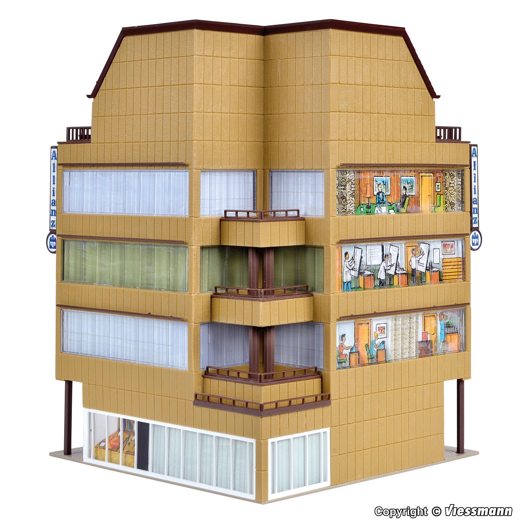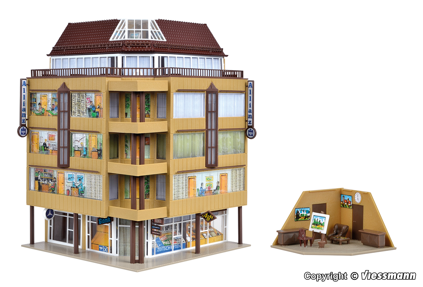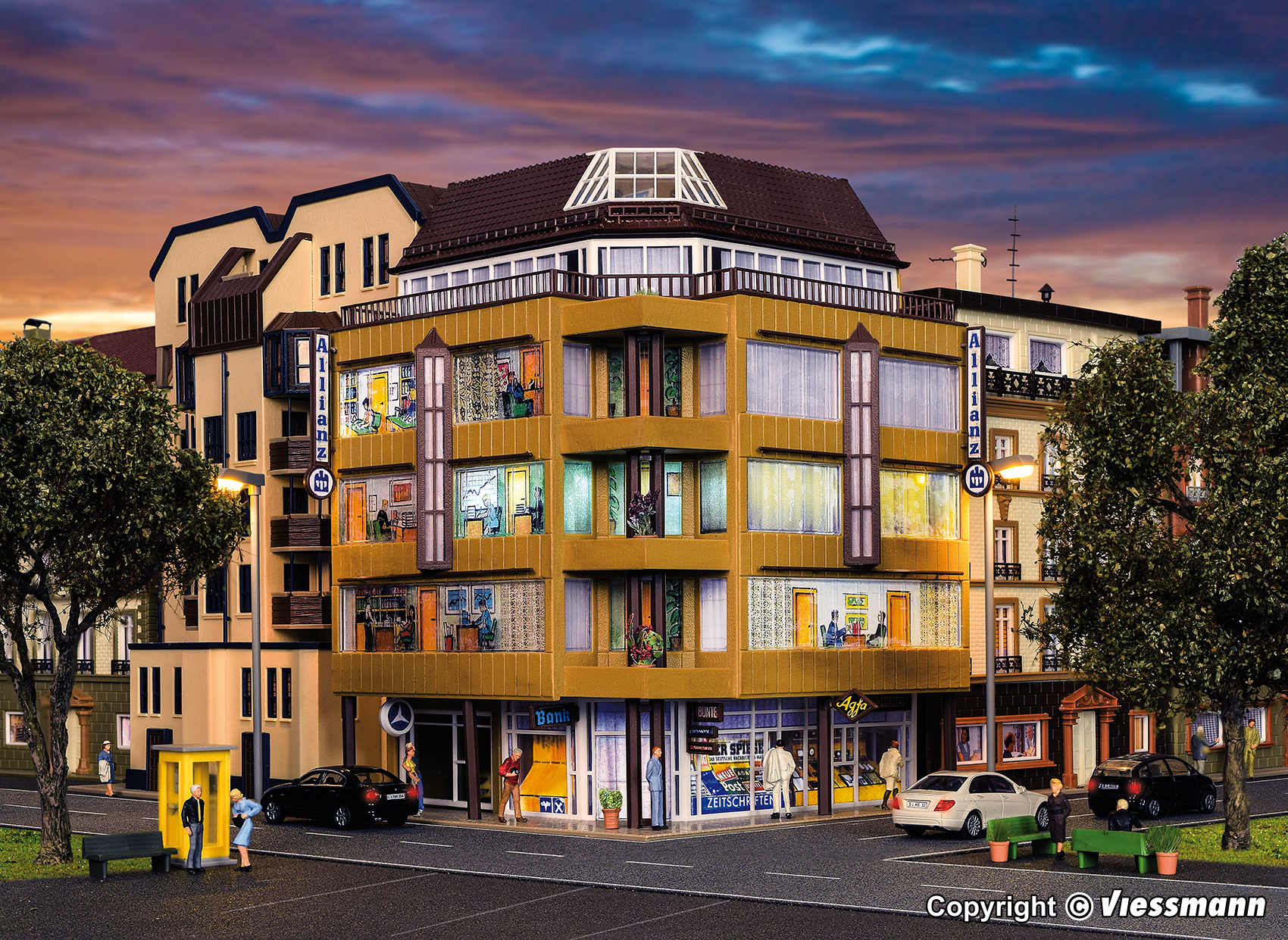 Modernes, mehrgeschossiges Eckhaus mit Wohn- und Geschäftsräumen. Es verfügt über eine Dachterrasse und ein liebevoll eingerichtetes Künstler-Atelier.