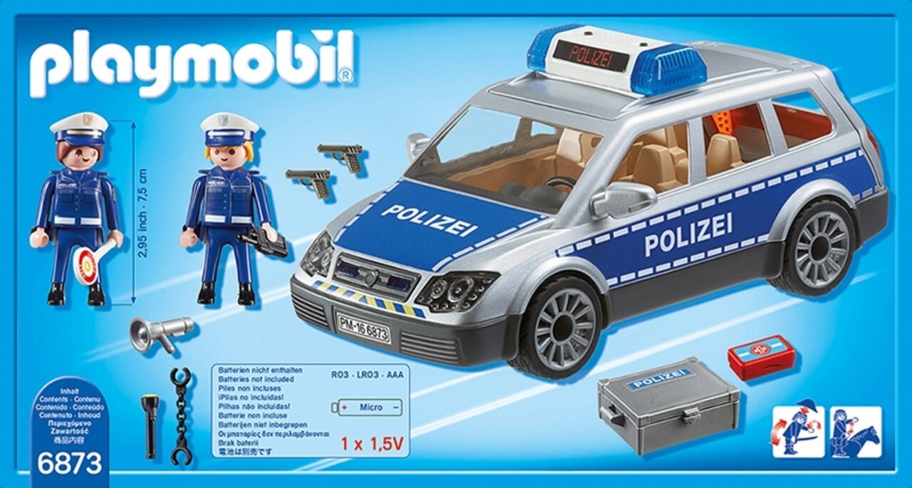 Zubehör: 1 Polizeiwagen, 1 Funkgerät, 1 Megafon, 1 Paar Handschellen, 1 Taschenlampe, 2 Pistolen, 1 Koffer, 1 Erste-Hilfe-Box, 2 Polizeidienstmützen, 1 Polizeikelle
