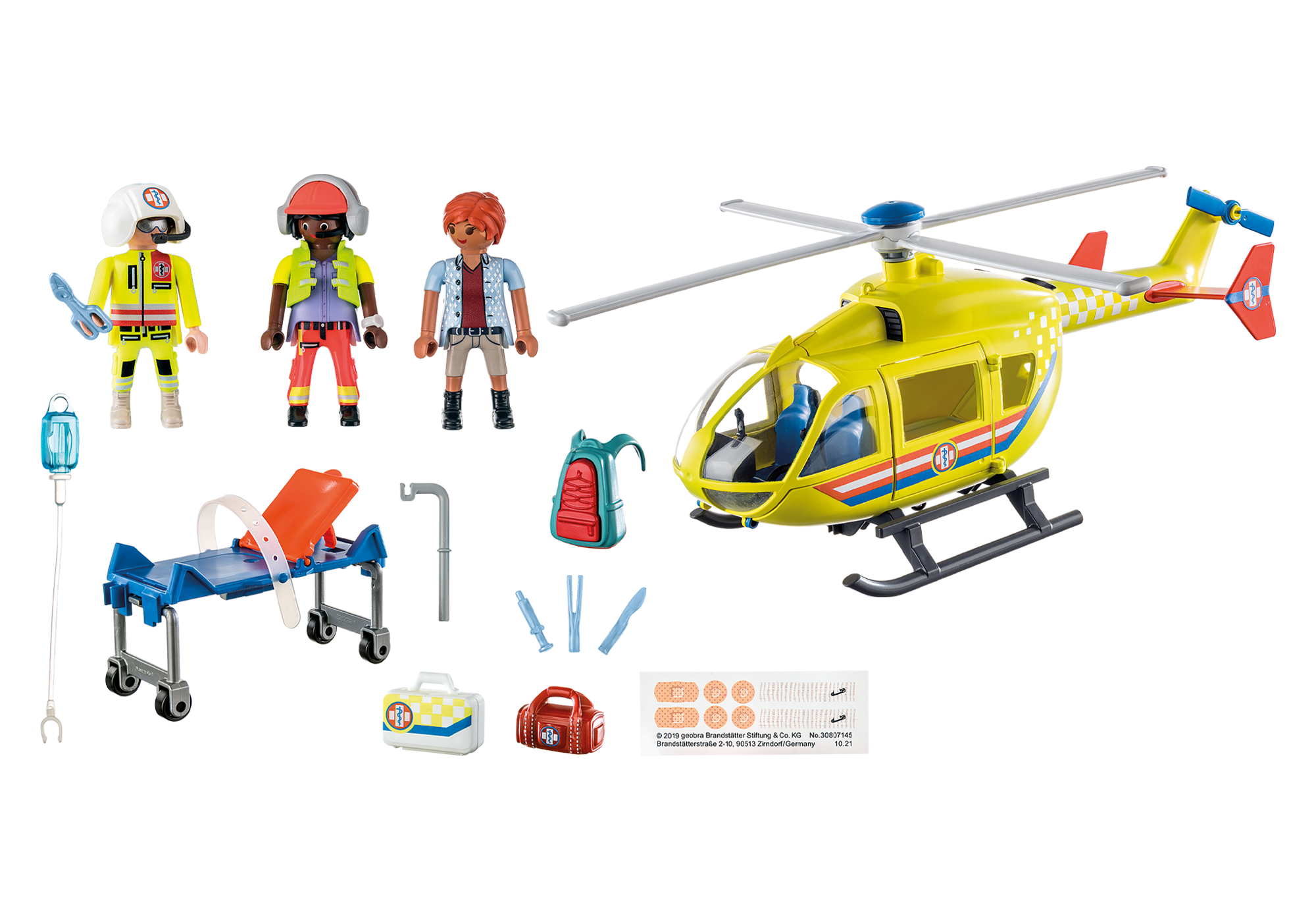 Das PLAYMOBIL-Spielzeug für Kinder ab 4 Jahren enthält drei PLAYMOBIL-Figuren, einen Rettungshubschrauber, eine Krankentransportliege, Erste-Hilfe-Set, Verbandskoffer und viele weitere Extras für aufregende Spielaction im Kinderzimmer. Mit den beiliegenden Verbandsetiketten können die Verletzten individuell versorgt werden. Die Rollbeine der Liege können eingeklappt und die Liege kann von zwei Personen an Griffen getragen werden.