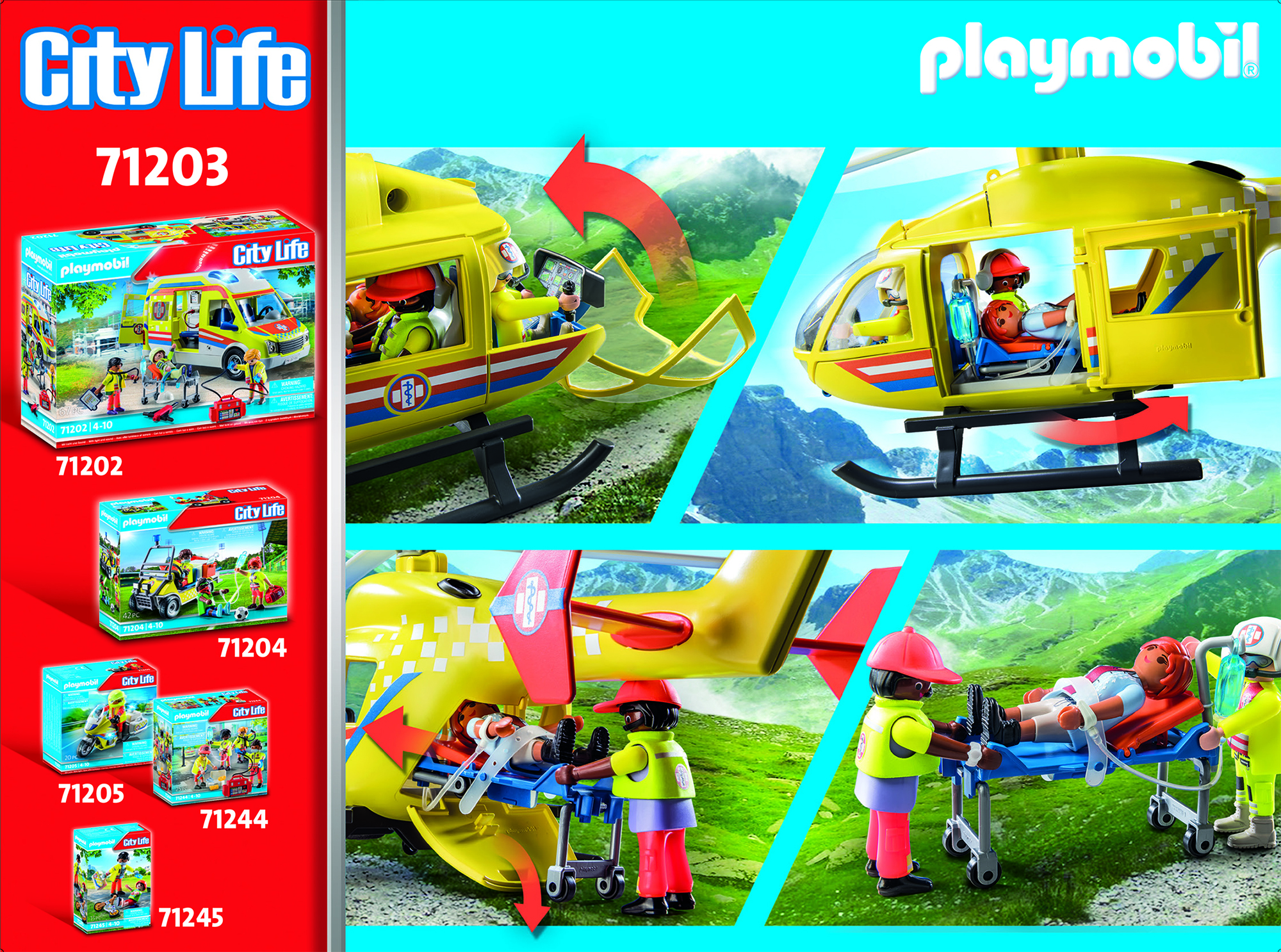 PLAYMOBIL-Rettungshelikopter in moderner Optik! Mit der Rettungstrage kann die verletzte Wanderin transportiert werden. Die Rotorblätter sind beweglich.