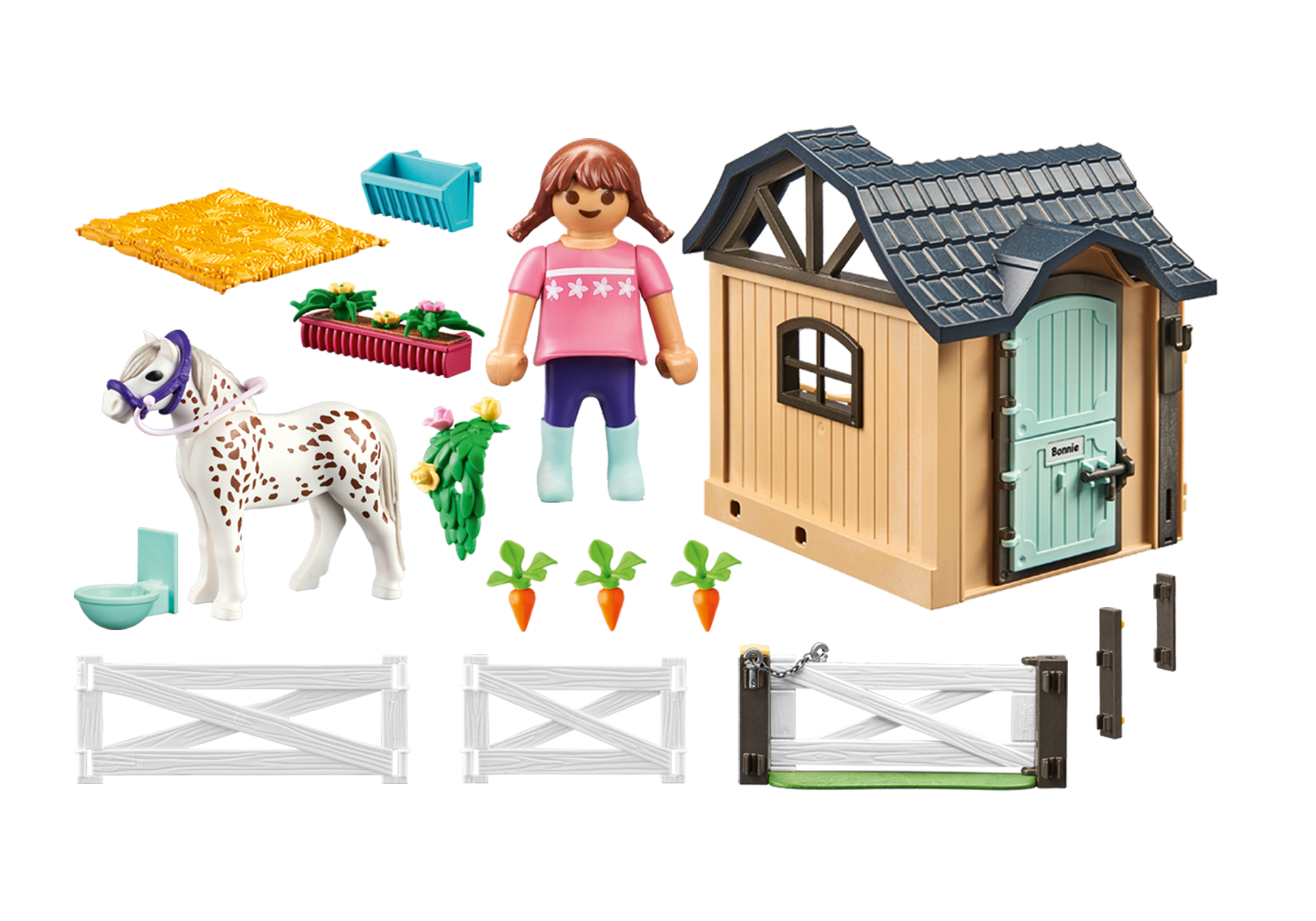 Dieses liebevoll gestaltete Pferde-Set enthält eine PLAYMOBIL-Figur, ein Pony, eine Reitstallerweiterung, Tränke, Blumenkasten und weitere tolle Extras. Stall- und Gattertür können geöffnet und verriegelt werden. Ein tolles Ergänzungsset für Pferdefans ab 4 Jahren.