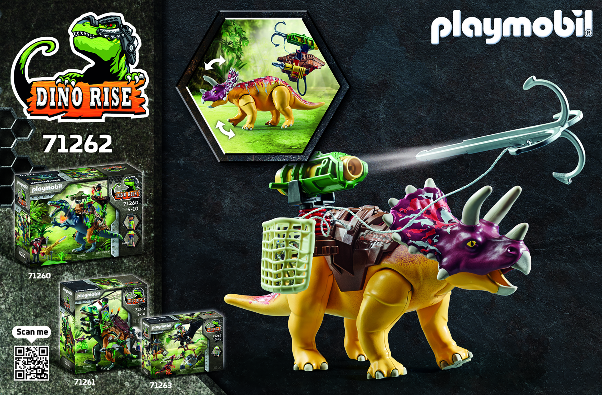 • Das Spielzeugset enthält den Dino Rise-Helden Milow und eine weitere PLAYMOBIL-Figur, einen Triceratops mit Rückenpanzer, Kanonen und Enterhaken-Geschoss sowie Pfeil und Bogen und weitere dinostarke Extras.