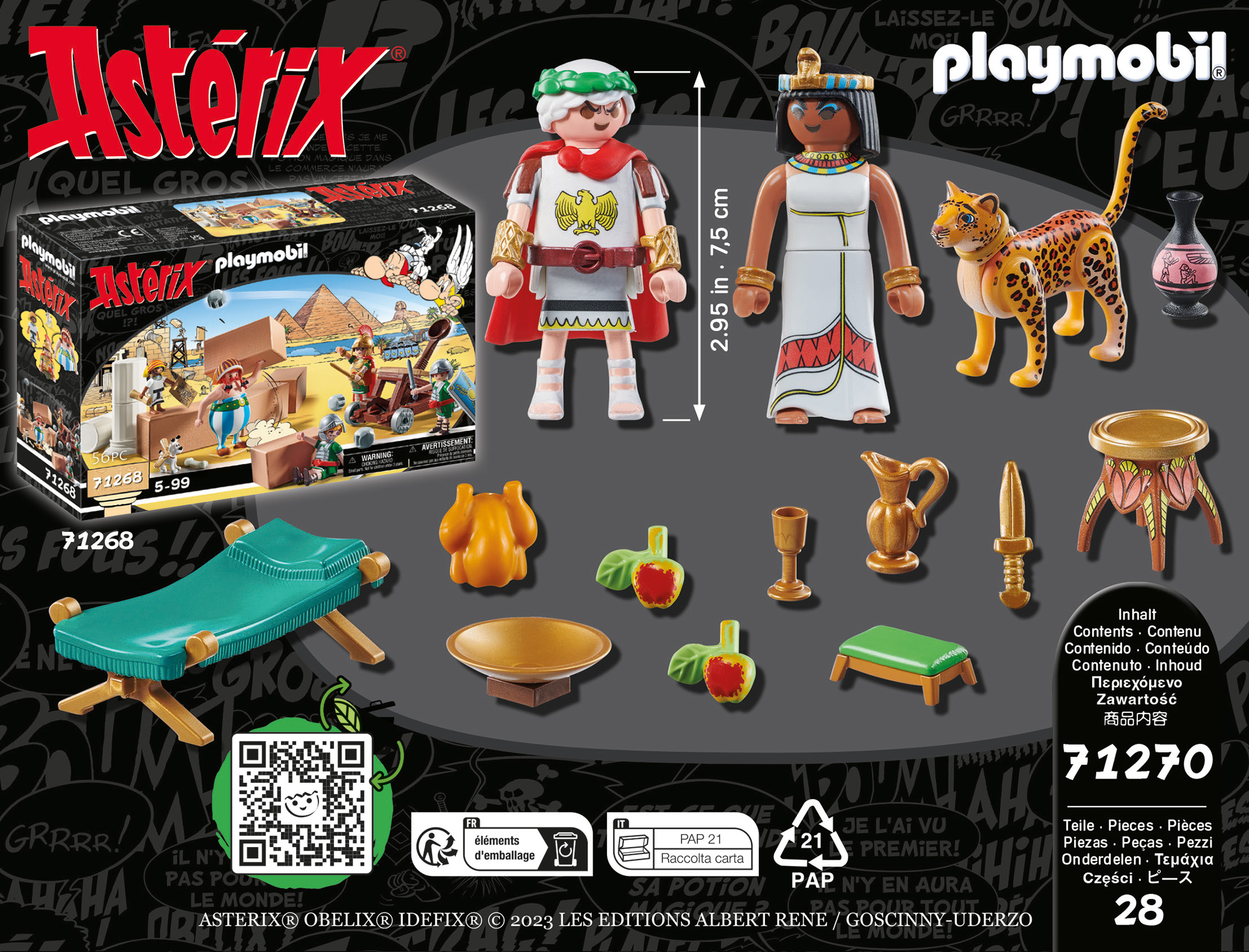 Das 28-teilige Asterix Spielzeugset enthält Kleopatra und Cäsar PLAYMOBIL-Figuren, den berühmten Leoparden sowie eine Chaiselongue, ein Tischchen, eine Vase, einen Krug, ein Diadem und weitere tolle Extras für lustige Asterix-Rollenspiele.