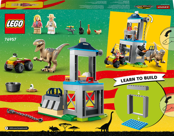 LEGO® Jurassic Park Flucht des Velociraptors (76957) ist ein fantastisches Spielset, mit dem Kinder ab 4 Jahren das Bauen und Spielen lernen. Dem Set diente eine legendäre Filmszene aus Jurassic Park als Vorbild. Das Modell besteht aus einem Dinosauriergehege mit Turm, Ausbruchfunktion und Seilwinde, um das Futter für den Velociraptor hinabzulassen. Das Set beinhaltet außerdem ein Quad zum Zusammenbauen, 2 Minifiguren und faszinierendes Zubehör, das junge Kinder kreativ spielen lässt. Eine tolle Geschenkidee. Digitale Bauanleitung Die einfache Bildanleitung eignet sich für Kinder, die gerade erst lesen lernen. Für zusätzlichen Bauspaß beinhaltet die LEGO Builder App intuitive Vergrößerungs- und Drehfunktionen, die Kinder beim Bauen ein digitales Modell näher betrachten lassen. Gemeinsam bauen LEGO 4+ Bauspielzeuge stellen Kindern ein ganzes Spieluniversum mit beliebten Kino- und Fernsehfiguren und vielen Heldinnen und Helden des Alltags vor. Spezielle Starter-Bauelemente lassen sogar Anfänger Fahrzeuge, Gebäude und viele andere Modelle bauen. Kleine Hilfestellungen älterer Geschwister oder der Eltern reichen völlig.