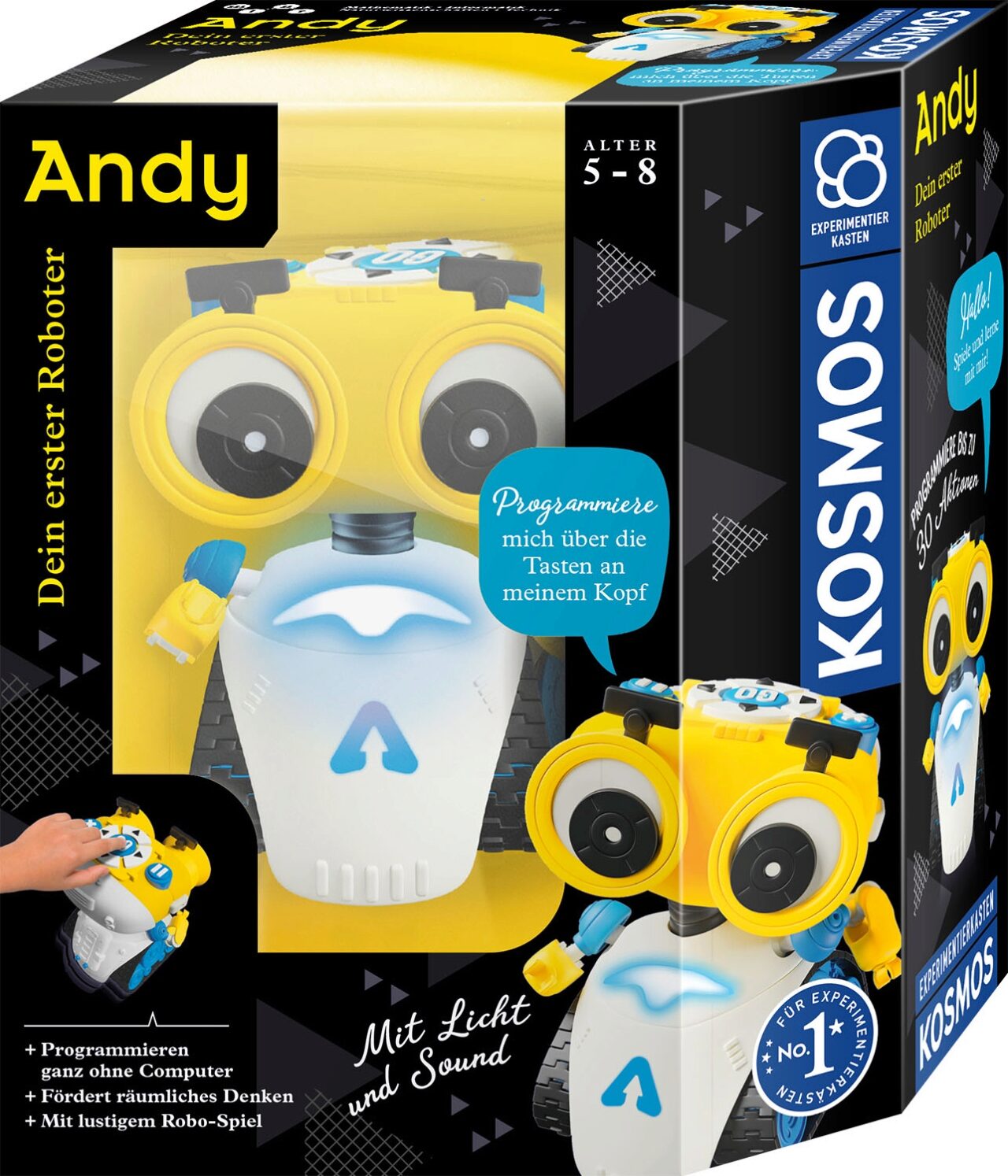 Der spielerisch leichte Einstieg in die Roboter-Welt! Ganz ohne Computer wird Andy sofort lebendig, fährt durch das Kinderzimmer, gibt Töne von sich und lässt Lichter blinken. Das Beste: Andy wird bereits fertig aufgebaut geliefert und ist damit direkt startklar. Bereit für den Spiele-Modus? Mit spannenden Spielkarten wird Andy auf Missionen geschickt und muss die Einzelteile seiner Robo-Kumpel einsammeln. Der neue Roboterfreund ist aber nicht nur Spielkamerad, sondern auch Programmierlehrer! Mit den Knöpfen auf seinem Kopf wird er gesteuert und bis zu 30 Aktionen können kinderleicht eingespeichert werden. Durch den KOSMOS Experimentierkasten haben auch die ganz Kleinen zwischen 5 und 8 Jahren die ersten Grundlagen des Programmierens erlernt.
