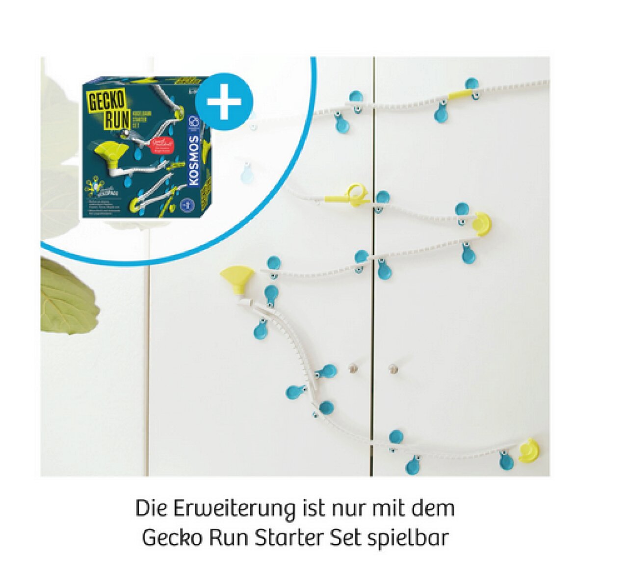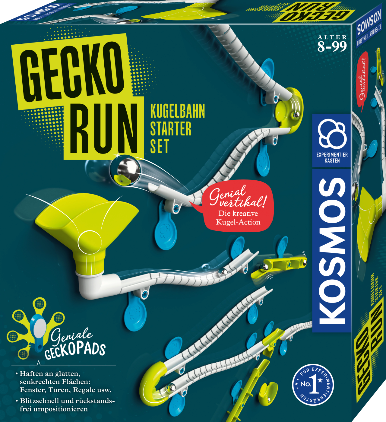 - Ob über Hindernisse hinweg, ob an Türen, Glasscheiben, Fliesen oder Regalen – mit dem Starter Set der KOSMOS Kugelbahn „Gecko Run“ wird getestet, was alles möglich ist!