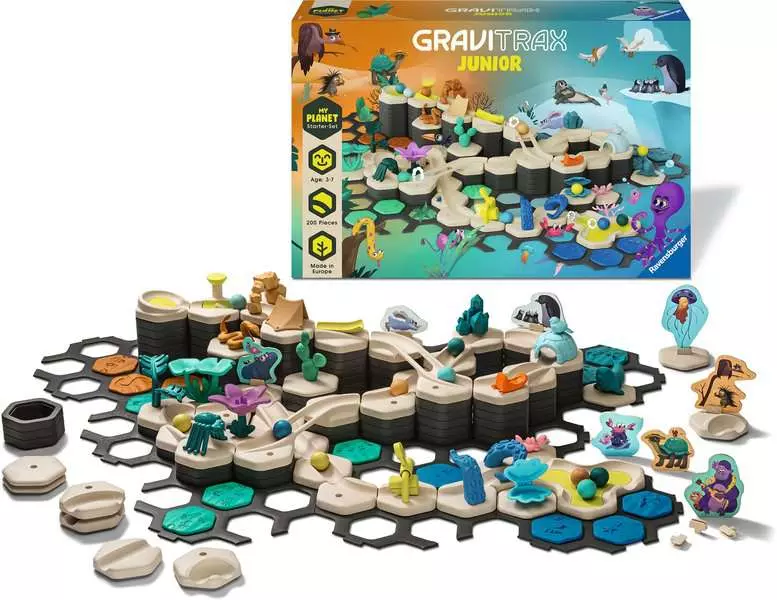 GraviTrax Junior ist ein interaktives Kugelbahnsystem für Kinder ab 3 Jahren. Jungs und Mädchen erschaffen ihre eigenen Kugelbahnwelten, die flexibel dekoriert werden können, sodass individuelle Themenwelten entstehen. Bau- und Spielspaß werden dabei vereint.