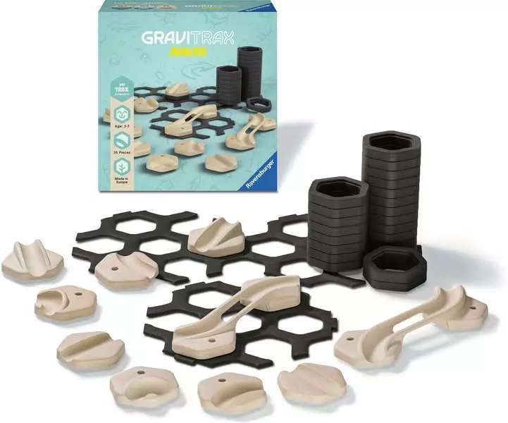 GraviTrax Junior ist ein interaktives Kugelbahnsystem für Kinder ab 3 Jahren. Jungs und Mädchen erschaffen ihre eigenen Kugelbahnwelten, die flexibel dekoriert werden können, sodass individuelle Themenwelten entstehen. Bau- und Spielspaß werden dabei vereint.