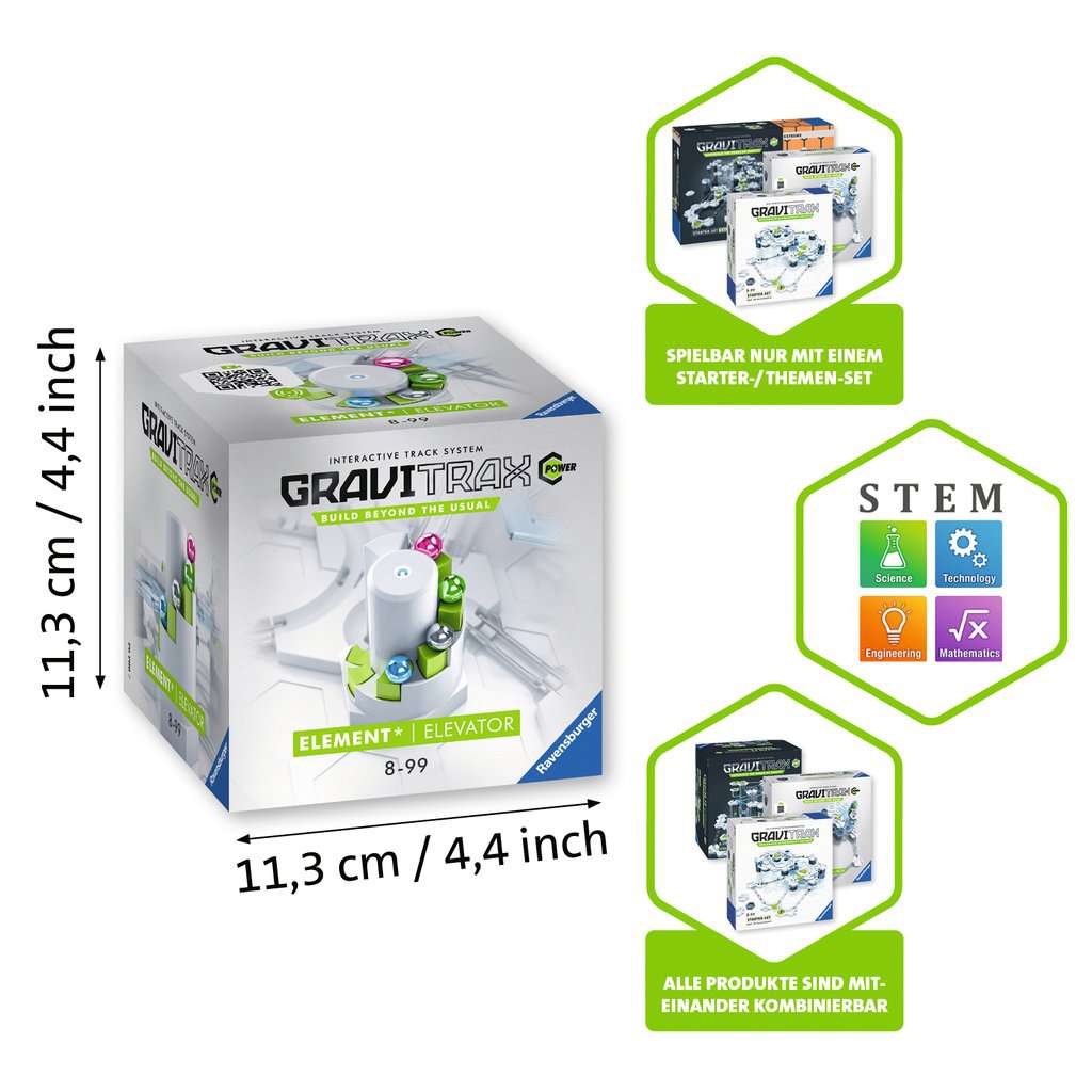 Höhe gewinnen, längere Laufzeiten realisieren und neue coole Effekte: Das POWER Element Elevator transportiert auf Wunsch mehrere Kugeln zeitgleich bis zu 7 Höhensteine ohne manuelles Rückstellen nach oben. Sobald eine Kugel den Elevator erreicht, befördern sie die Lifttreppen automatisch auf höhere Bahnebenen. Kombiniert mit einem Starter-Set eröffnet der Elevator neue Bahnverläufe, bringt zusätzliche Action und Variabilität. Für wiederholte Höhe, mehr Durchläufe der Kugeln durch die Bahn.