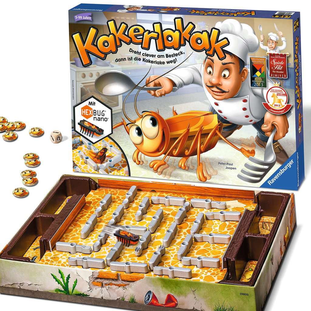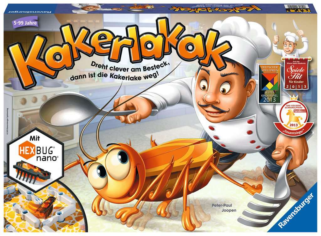 Flink saust die Kakerlake durch die Küche! Jetzt heißt es, keine Zeit zu verlieren. Wer kann sich das herumwuselnde Insekt mit Hilfe des ausliegenden Bestecks schnappen? Der Würfel entscheidet, ob Gabel, Messer oder Löffel gedreht werden. Wird das Besteck geschickt gedreht, kann die Kakerlake in einer Falle gefangen werden. Wem die Kakerlaken-Falle gehört, bekommt einen Chip. Die Jagd auf das lichtscheue Krabbeltier gewinnt, wer zuerst fünf Chips ergattern konnte!Das Ausgangslabyrinth kann bei jeder neuen Spielrunde variiert werden – letztendlich beweist die Kakerlake aber immer wieder, dass sie einen eigenen Kopf hat und ganz anders abbiegt, als erwartet! Kakerlakak ist eine rasante und lustige Jagd für clevere Fallensteller mit original HEXBUG® nano™. Ausgezeichnet mit mehreren Preisen, unter anderem mit dem Deutschen Spielepreis als Bestes Kinderspiel 2013.