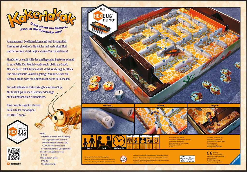| Inhalt/ Ausstattung | 1 HEXBUG® nano®, 1 dreidimensionaler Spielplan mit 24 drehbaren Besteckteilen, 18 Kakerlaken-Chips, 2 Türen, 1 Würfel, 1 Spielanleitung |