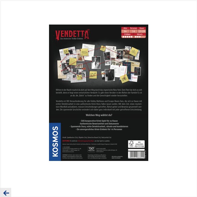 | Inhalt/ Ausstattung | 72 Spielkarten, 13 Objekte, 1 Detective Board, 1 Notizzettel |