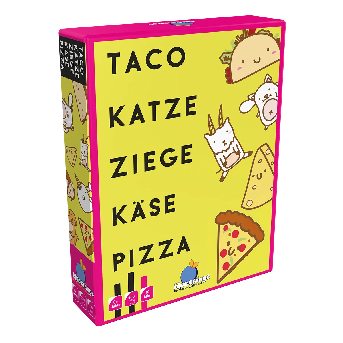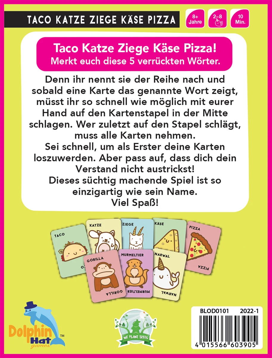 Taco Katze Ziege Käse Pizza! Klingt absurd – ist es auch! Genau das ist der Spaß an dem schnellen Partyspiel von Blue Orange. Die Spieler versuchen, sich diese fünf Begriffe und auch ihre Reihenfolge zu merken, denn sie müssen sie aufsagen, während sie ihre Karten ablegen. Passt der Begriff zur Karte, sollte schnell reagiert und zugeschlagen werden! Der letzte Spieler, der seine Hand auf den Kartenstapel in der Mitte schlägt, hat diese Runde verloren und muss alle Karten aufnehmen. Ziel ist es jedoch, alle seine Karten loszuwerden.
