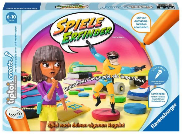 Werdet zum Spiele-Erfinder! In einem spannenden Wettlauf versuchen die Spieler Aufgaben zu erfüllen und den Siegerpokal zu erreichen. Neben bestehenden Aufgaben erstellen die Spieler auch eigene und nehmen diese mit dem tiptoi Stift auf. Singe ein Lied! Oder stehe auf einem Bein! So erfinden sie das Spiel immer wieder neu und machen es zu ihrem Spiel. CREATE Spiele-Erfinder fördert Kreativität und Einfallsreichtum.