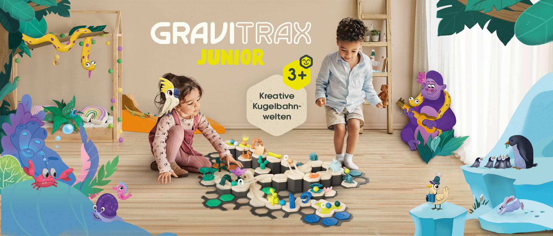 GraviTrax Junior ist ein offenes Systemspielzeug, bestehen aus Starter-Sets, Extensions (Erweiterungen) und Elements (Action-Steinen). Alle Junior-Produkte sind miteinander kompatibel und kombinierbar, sodass die eigene Kugelbahnwelt nach Belieben vergrößert und erweitert werden kann.